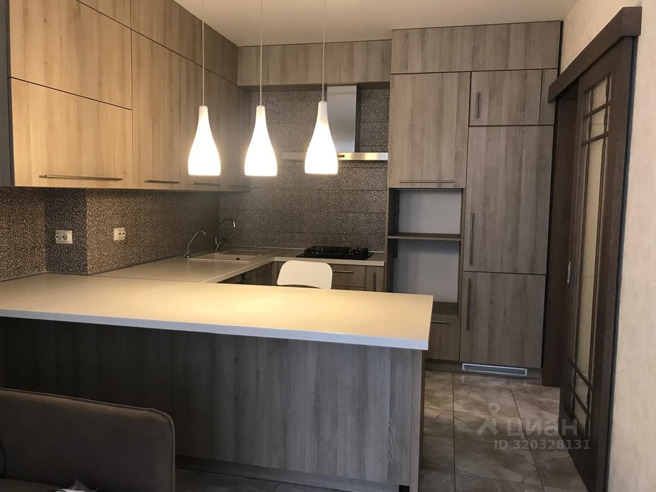 Кухня-гостиная: кухонный гарнитур с встроенной техникой, диван, полки, кронштейн для телевизора, посудомойка, встроенный холодильник, плита, вытяжка над плитой, фильтр с осмосом, зонированное освещение;