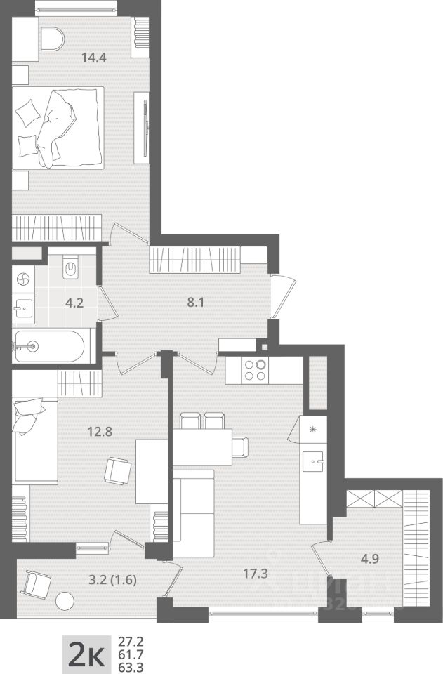 Продаётся 2-комнатная квартира в строящемся доме (Дом 1.2), срок сдачи: IV-кв. 2026, общей площадью 63.3 кв.м., на 3 этаже. Новый жилой комплекс "МОре" от Строительной компании "Меркурий" расположен по адресу: Калининградская область, г. Пионерский, пос. Рыбное.
