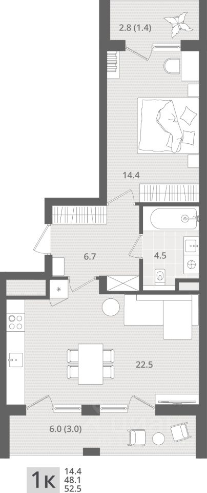 Продаётся 1-комнатная квартира в строящемся доме (Дом 1.1), срок сдачи: IV-кв. 2026, общей площадью 52.5 кв.м., на 4 этаже. Новый жилой комплекс "МОре" от Строительной компании "Меркурий" расположен по адресу: Калининградская область, г. Пионерский, пос. Рыбное.
