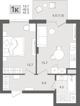 Продаётся 1-комнатная квартира в строящемся доме (Дом 1.1), срок сдачи: IV-кв. 2026, общей площадью 42.3 кв.м., на 1 этаже. Новый жилой комплекс "МОре" от Строительной компании "Меркурий" расположен по адресу: Калининградская область, г. Пионерский, пос. Рыбное.