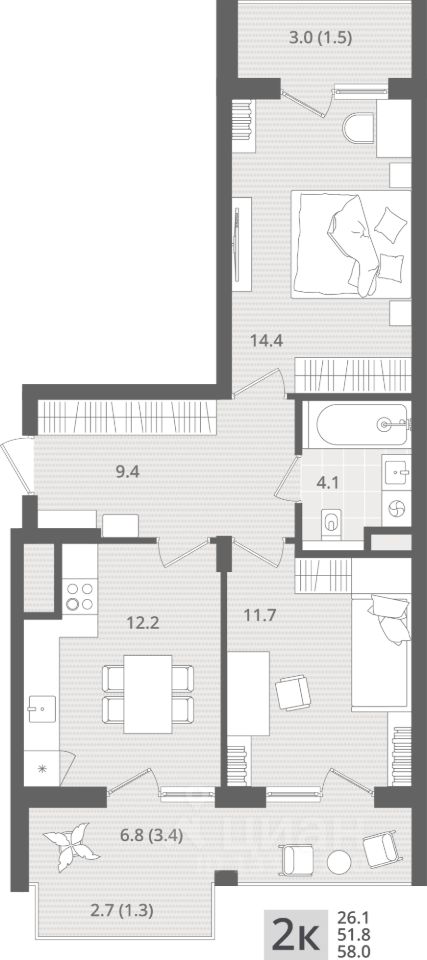 Продаётся 2-комнатная квартира в строящемся доме (Дом 1.1), срок сдачи: IV-кв. 2026, общей площадью 58 кв.м., на 3 этаже. Новый жилой комплекс "МОре" от Строительной компании "Меркурий" расположен по адресу: Калининградская область, г. Пионерский, пос. Рыбное.