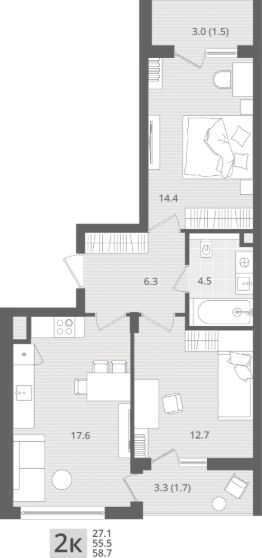 Продаётся 2-комнатная квартира в строящемся доме (Дом 1.1), срок сдачи: IV-кв. 2026, общей площадью 58.7 кв.м., на 1 этаже. Новый жилой комплекс "МОре" от Строительной компании "Меркурий" расположен по адресу: Калининградская область, г. Пионерский, пос. Рыбное.
