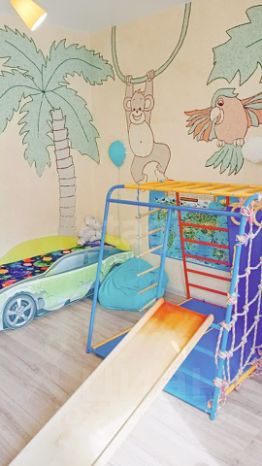 В детской комнате теплые полы, с зоной деления по интересам выполнены перегородки.