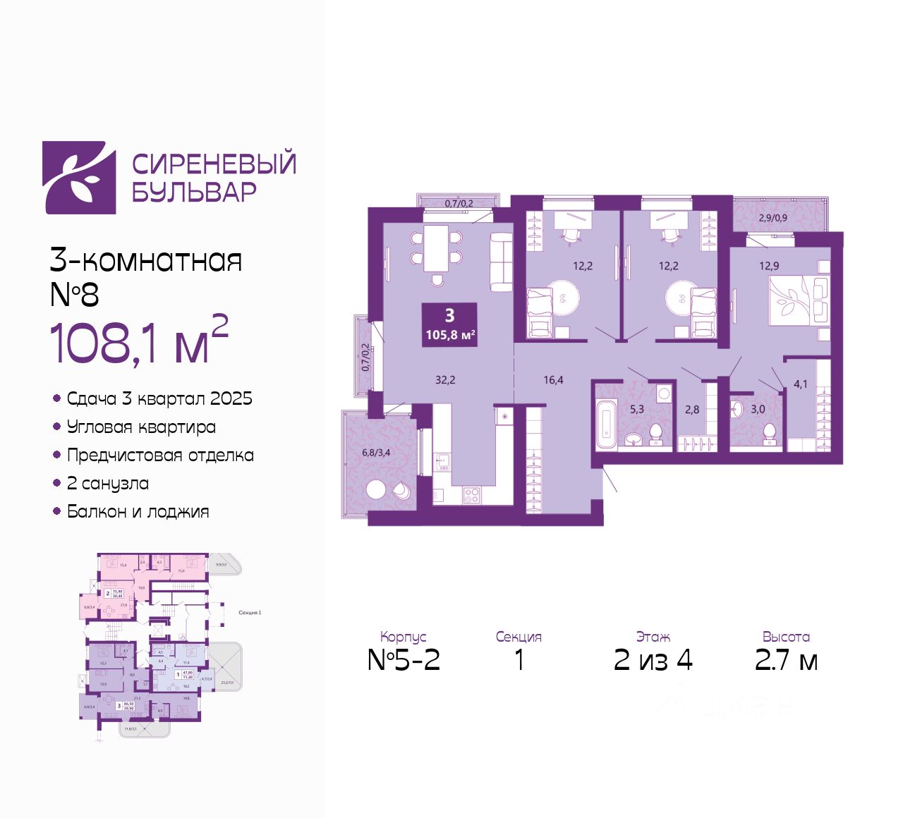 3-комн. квартира с предчистовой отделкой в ЖК "Сиреневый бульвар" на 2 этаже. Общая площадь: 108.1 кв.м., жилая: 37.3 кв.м., площадь просторной кухни-столовой: 32.2 кв.м. Квартира угловая, идеально подойдет любителям тишины и панорамных видов. В квартире два балкона и две лоджии, один совмещенный и один раздельный санузел. Высота потолков 2.7 м.