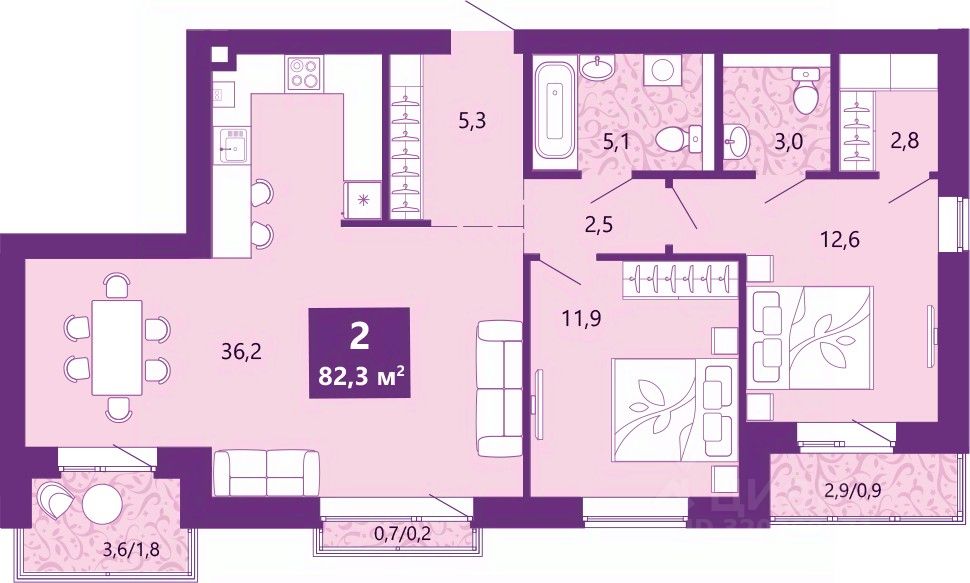Просторная 2-комн. квартира с предчистовой отделкой в ЖК "Сиреневый бульвар" на 3 этаже. Общая площадь: 83.5 кв.м., жилая: 24.5 кв.м., площадь просторной кухни-столовой: 36.2 кв.м. Угловая квартира, очень светлая, естественная вентиляция при открытии окон. В квартире один балкон и две лоджии, один совмещенный и один раздельный санузел. Высота потолков 2.7 м.