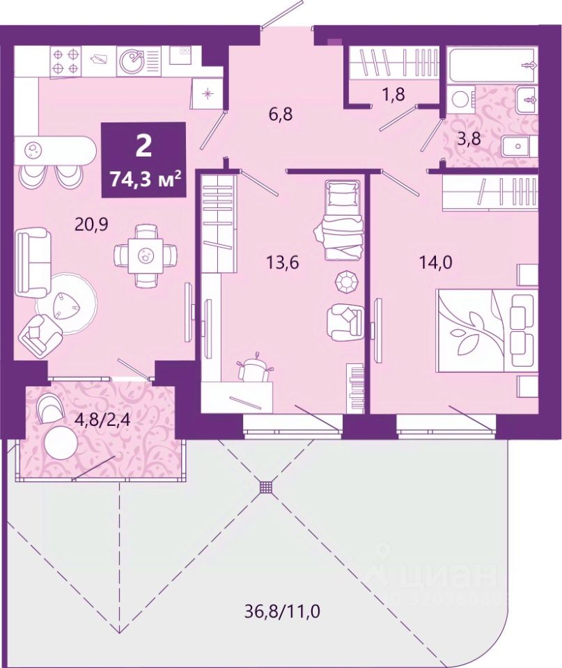 Просторная двухкомнатная квартира с предчистовой отделкой в ЖК "Сиреневый бульвар" на 1 этаже. Общая площадь: 75.1 кв.м., жилая: 27.9 кв.м., площадь просторной кухни-столовой: 20.9 кв.м. Комнаты изолированные, все окна выходят на одну сторону. В квартире один балкон, один совмещенный санузел. Наличие террасы в квартире открывает возможность для создания зон отдыха в кругу семьи и друзей. Высота потолков 2.7 м.