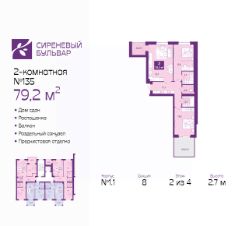 2-комн. квартира от застройщика с предчистовой отделкой в ЖК "Сиреневый бульвар" на 2 этаже. Общая площадь: 79.2 кв.м., жилая: 29.4 кв.м., площадь просторной кухни-столовой: 23.1 кв.м. Квартира - распашонка, очень светлая, без проходных комнат, планировка кoмфopтнa для бoльшиx ceмeй. В квартире один балкон, один раздельный санузел. Наличие террасы в квартире открывает возможность для создания зон отдыха в кругу семьи и друзей. Высота потолков 2.7 м.