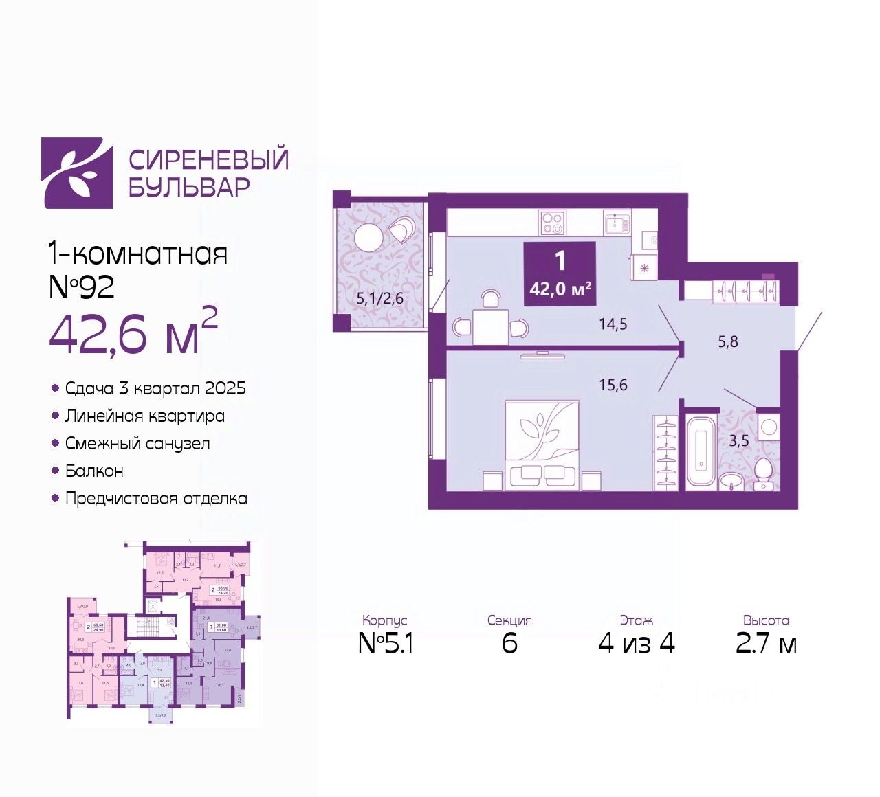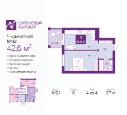 1-комн. квартира с предчистовой отделкой в ЖК "Сиреневый бульвар" на 4 этаже. Общая площадь: 42.6 кв.м., жилая: 15.6 кв.м., площадь просторной кухни-столовой: 14.5 кв.м. Все окна выходят на одну сторону. В квартире один балкон, один совмещенный санузел. Высота потолков 2.7 м.
