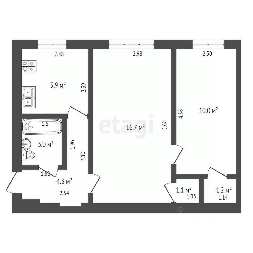 Общая площадь 42,2 кв.м. Комнаты 16,7 кв.м. и 10 кв.м. смежные. Санузел совмещен 3 кв.м.