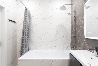В санузле отделка кафелем, напольное покрытие - ламинат, плитка.