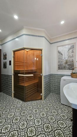 1 ванная с двумя окнами, душкабиной, и САУНОЙ Harvia, встроенная стиральная машина, мойдодыр и унитаз.