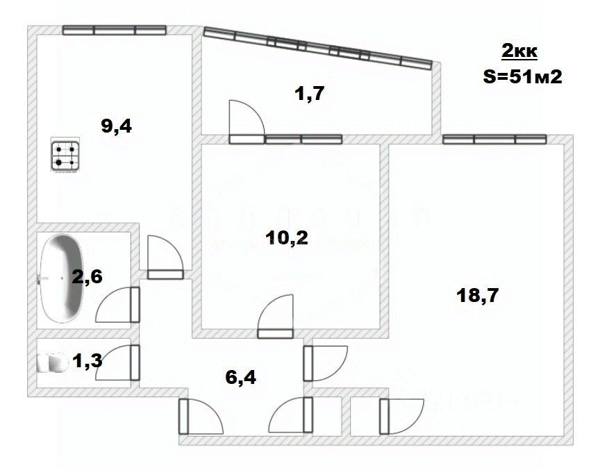 - балкон (1.7) с панорамным остеклением (дверь балкона сделана прямо из кухни, на что получено официальное разрешение);