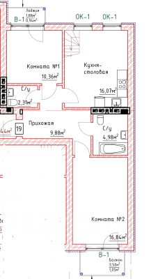Общая площадь квартиры 67,2 кв.м, площадь кухни - гостиной 16,07 кв.м., площадь комнаты 16,84 кв.м., + 10,36, два санузла 4,98 кв.м. + 2,31 кв.м., коридор 9,88 кв.м., застекленная лоджия 3,4 кв.м., балкон 1, 8 кв.м.