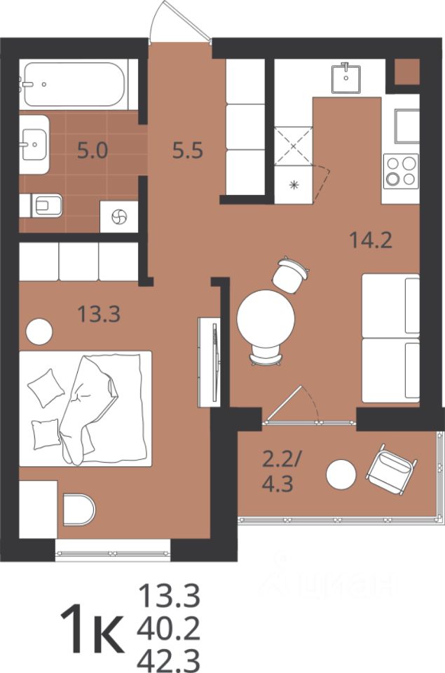 Большой выбор квартир: от студий до 3-комнатных, с разными вариантами планировок и балконов