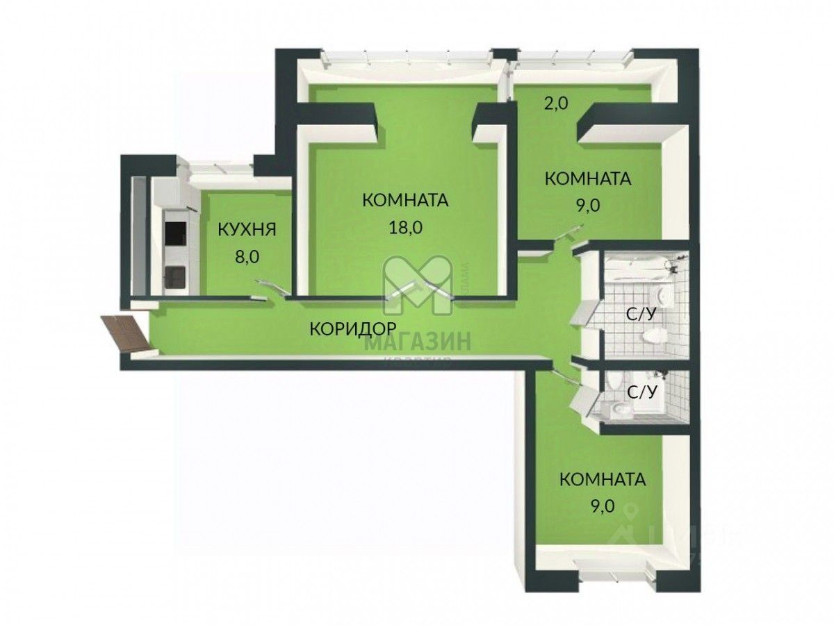 В квартире выполнена современная перепланировка: увеличены две комнаты за счет выставленных оконных проемов.