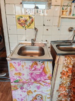 Кухня оборудованна отдельным столом, мойкой, газовой плитой,