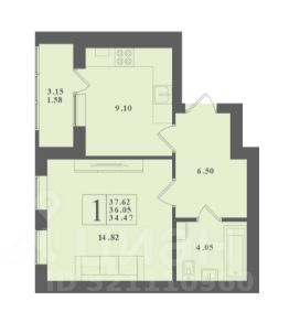 Площадь 1 комнатной квартиры - 36,43м2