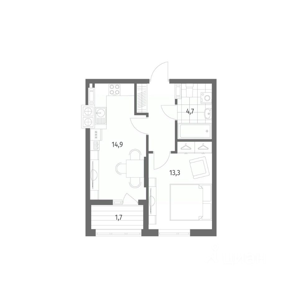 в Дом на Красной от компании ГК "ТРЕСТ". Площадь кухни 14.9 м².  Жилой комплекс комфорт-класса "Дом на Красной" расположен в Центральном районе Калининграда на пересечении улиц Красная и Псковская. Жилой комплекс включает в себя два дома высотой 8 этажей. Срок сдачи намечен на 4 квартал 2026 года.