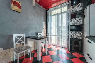 Общая площадь: 43,2 кв.м Комната: 19,2 кв.м (с панорамными окнами) Кухня: 9,5 кв.м (выход на застекленный балкон) Санузел: просторный, раздельный Отделка: Ламинат в комнате, плитка в кухне/коридоре/санузле.