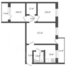 Жилая площадь составляет 42 кв. м, включая три комнаты (17 кв. м, 14 кв. м и 13 кв. м), что обеспечивает комфортное размещение семьи. Кухня площадью 7 кв. м.