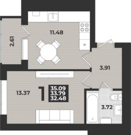 Продаётся 1-комнатная квартира в строящемся доме (Дом 3 (1 этап)), срок сдачи: II-кв. 2026, общей площадью 35.09 кв.м., на 9 этаже. Новый жилой комплекс "11 Мая" от застройщика "ГК Модуль-Стройград" расположен по адресу: г. Калининград, улица Согласия.