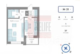 Функциональная планировка, общая площадь 37 кв. м., спальня 15,4 кв. м., кухня правильной формы 9,4 кв. м. с выходом на лоджию 3,2 кв. м.,, входная группа 5,9 кв. м., ванная комната 4,0 кв. м.