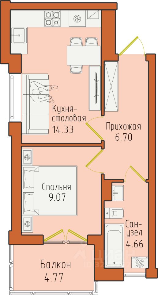 Однокомнатная квартира 43 на пятом этаже у Балтийского моря в Светлогорске.
