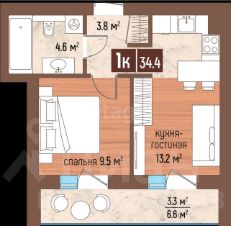 Площадь квартиры 34,4 кв.м. Кухня-гостиная 13,2 кв.м., спальня 9,5 кв.м. Большая ванная 4,6 кв.м. позволяет разместить сантехнику со стиральной машиной. Несомненным плюсом квартиры является огромный балкон площадью 6,8 кв.м! Где можно не только поставить шезлонги, но и разместить столик для приятных чаепитий на свежем воздухе!
