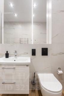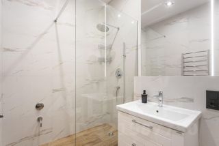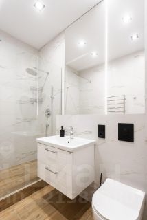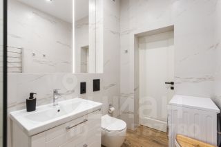 В санузле отделка кафелем, напольное покрытие - плитка, паркетная доска.