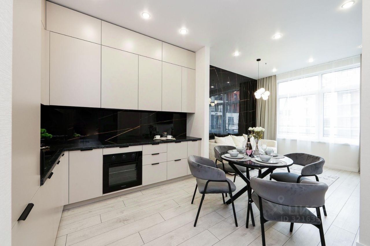 Кухня гостиная оборудована всем необходимым ( мебель, встроенный холодильник, посудомоечная машина, микроволновая печь, варочная поверхность, духовой шкаф, телевизор)