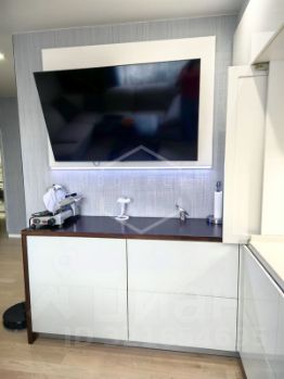 Установлена скрытая кухня с фасадами из белого стекла, что создает ощущение единого пространства с гостиной!
