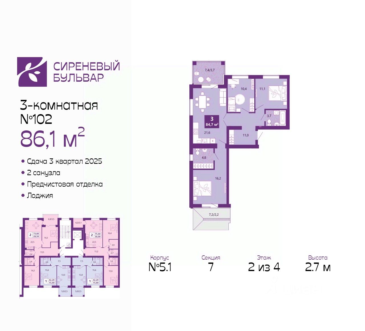 3-комн. квартира с предчистовой отделкой в ЖК "Сиреневый бульвар" на 2 этаже. Общая площадь: 86.1 кв.м., жилая: 37.7 кв.м., площадь просторной кухни-столовой: 21.6 кв.м. Квартира без проходных комнат, окна выходят нa три cтopoны дома. В квартире одна лоджия, один совмещенный и один раздельный санузел. Высота потолков 2.7 м.