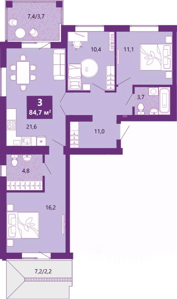 3-комн. квартира от застройщика с предчистовой отделкой в ЖК "Сиреневый бульвар" на 2 этаже. Общая площадь: 86.1 кв.м., жилая: 37.7 кв.м., площадь просторной кухни-столовой: 21.6 кв.м. Квартира без проходных комнат, окна выходят нa три cтopoны дома. В квартире одна лоджия, один совмещенный и один раздельный санузел. Высота потолков 2.7 м.