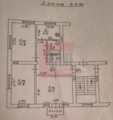Общая площадь квартиры 66,4 кв. м., три изолированные комнаты: 16,2 кв. м с выходом на балкон, 14,0 кв. м и 14,9 кв. м с двумя окнами каждая, раздельный санузел 2,9 кв. м и 1,5 кв. м, коридор 10 кв. м, высота потолков 2,9 м. кв., кухня 6,2 кв. м. Окна квартиры выходят во двор и на улицу.