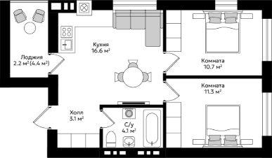 Продаётся 2-комнатная квартира в строящемся доме (Дом 1), срок сдачи: IV-кв. 2027, общей площадью 48 кв.м., на 1 этаже.