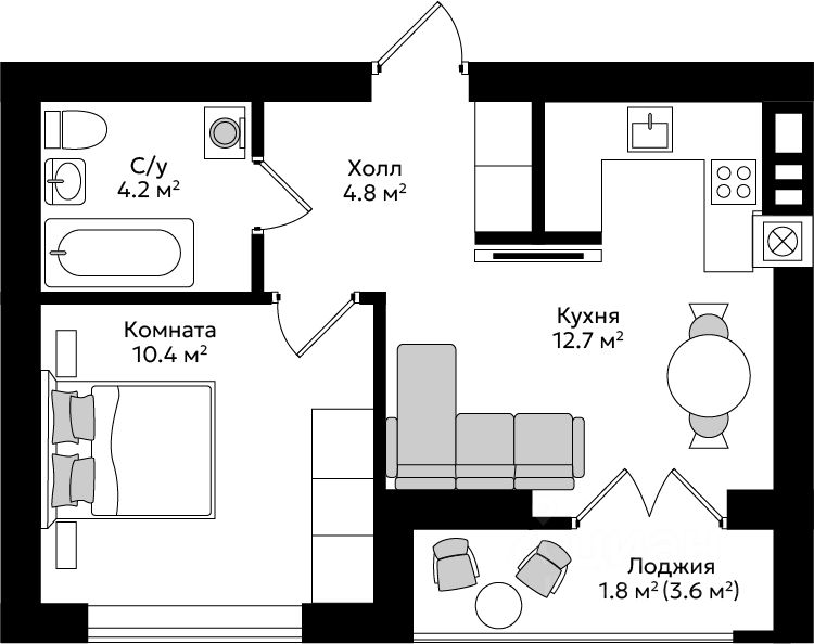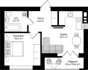 Продаётся 1-комнатная квартира в строящемся доме (Дом 1), срок сдачи: IV-кв. 2027, общей площадью 33.9 кв.м., на 1 этаже.