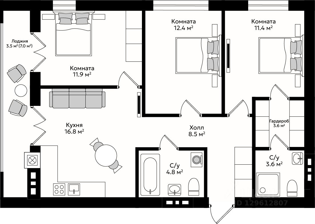 Продаётся 3-комнатная квартира в строящемся доме (Дом 2), срок сдачи: IV-кв. 2027, общей площадью 76.5 кв.м., на 6 этаже.