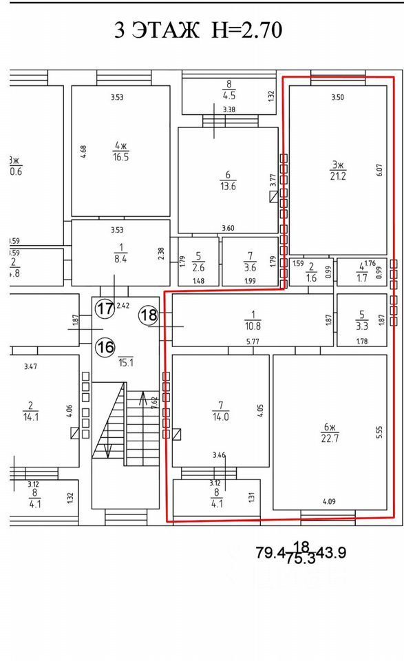 Общая площадь: 75 кв. м: комнаты 21,2 и 22,7 кв. м. Кухня 14 кв. м с выходом на лоджию. Спальня и кухня выходят на парковку, детская выходит во двор. Можно поменять местами.