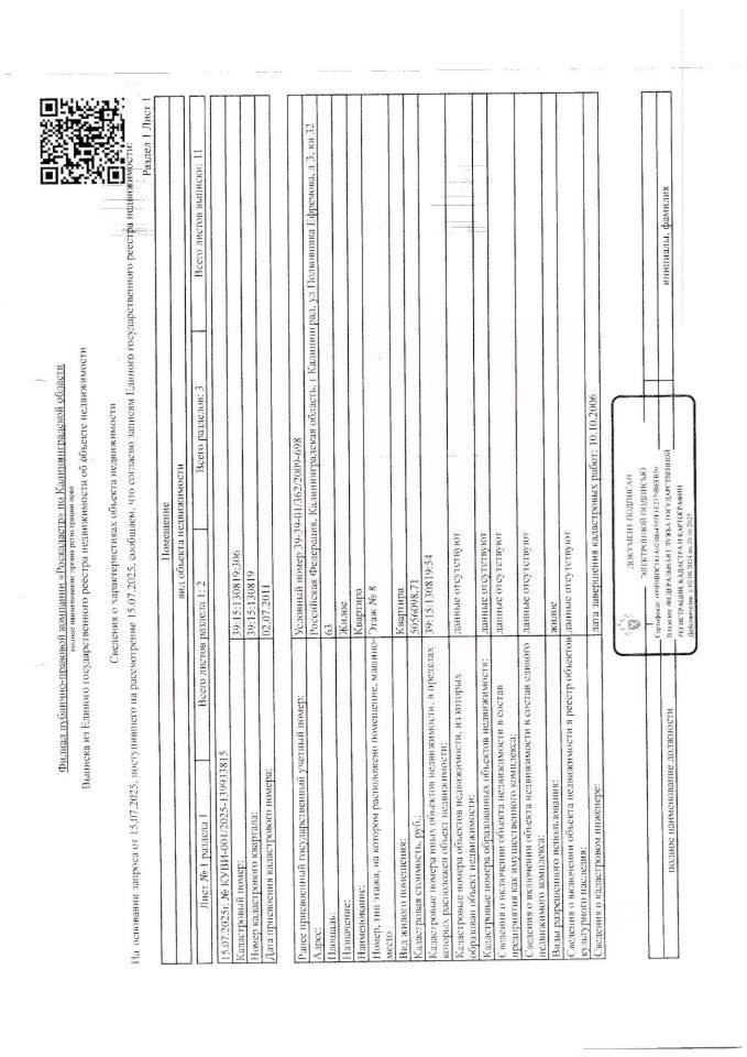 жилое помещение, этаж 8 местоположение по адресу: г. Калининград, ул. Полковника Ефремова, д. 3, кв. 32 1 Штука (шт)