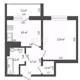 - Удобная, рациональная планировка: изолированная жилая комната площадью 13,8 м², просторная кухня 8,5 м², совмещенный санузел 4,1 м², отдельная кладовая 1,6 м², отапливаемая лоджия 2,2 м².