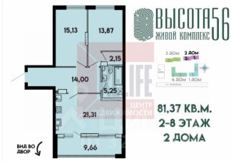 Общая площадь квартиры 81,37 кв. м. Планировка функциональна и продумана до мелочей: кухня 21,31 кв. м, с выходом на застекленную лоджию 9,66 кв. м спальня 15,13 кв. м, просторный холл 14,00 кв. м, спальня 13,87 кв. м. , ванная комната 5,25 кв. м. Окна выходят во двор.