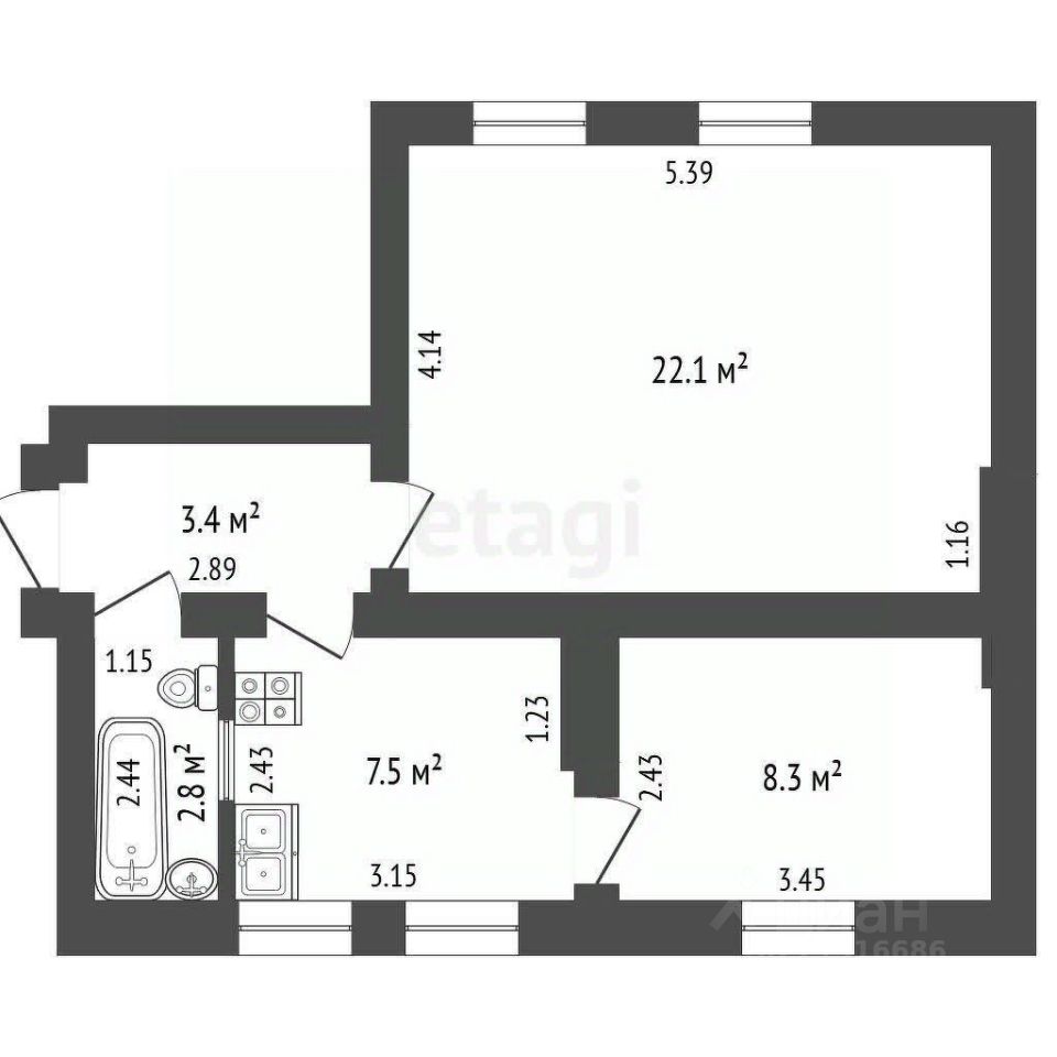 Общая площадь 44.1 кв.м.