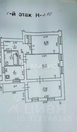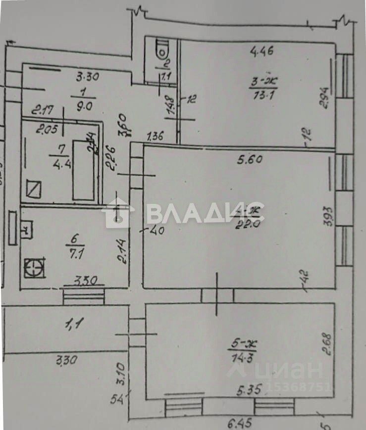 Общая площадь 74 кв.м: комнаты 13,1+22+14,3 кв.м., кухня 7,1 кв.м, санузел 1,1 кв.м и ванная комната 4,1 кв.м.
