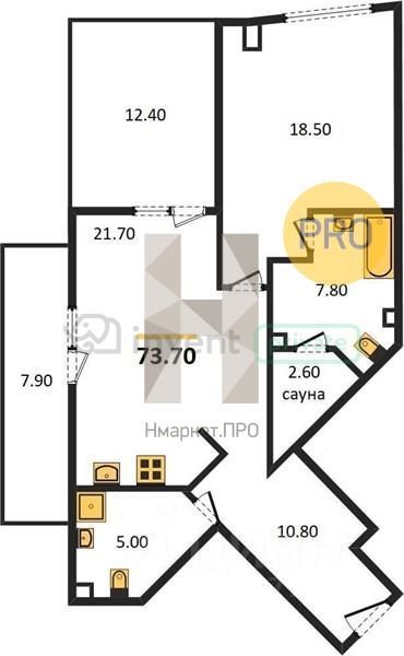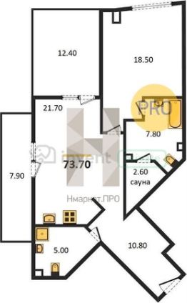 Общая площадь 73.7 м². Комната 18.5 м², кухня 21.7 м².