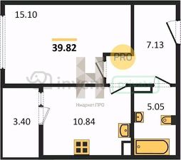 Общая площадь 39.82 м². Кухня 10.84 м², комната 15.1 м².