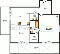 Общая площадь 80 м². Кухня 12,5 м², комната 1 - 14,2 м², комната 2 - 22,8 м²