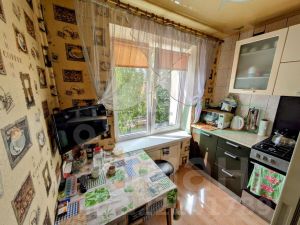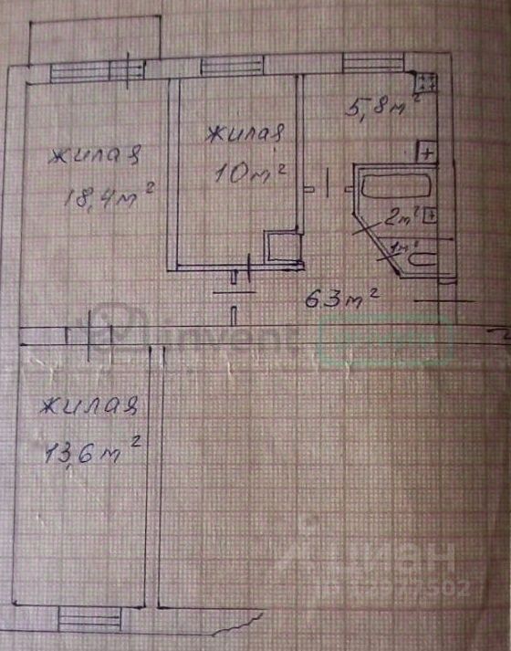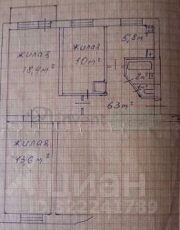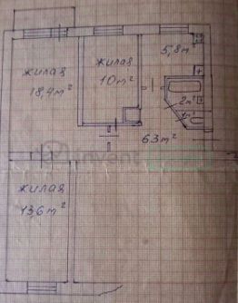 Общая площадь квартиры 57,4 кв.м. Кухня 5,8 кв.м, комната-1 10 кв.м, комната-2 13,6 кв.м, комната-3 18,4 кв.м. Центральное отопление. Есть счётчики на вoду. Окна выходят на двe cтopoны.