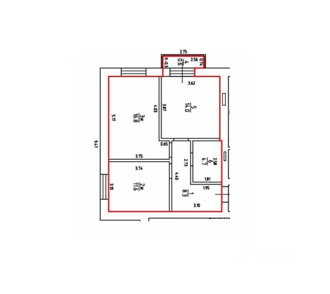 Площадь двух изолированных комнат - 16.8 кв.м + 11.6 кв.м