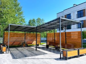 Также жилой комплекс предлагает современную концепцию жизни внутри двора -это Банный комплекс "Green bay" с кафе, уютными номерами для гостей , русской парной , купелью, джакузи под открытым небом и неповторимым дизайнерским интерьером.