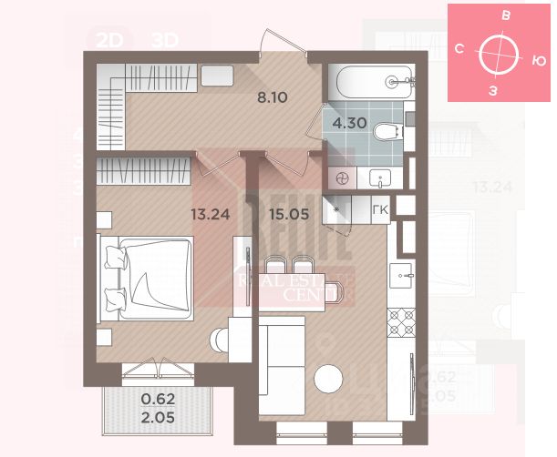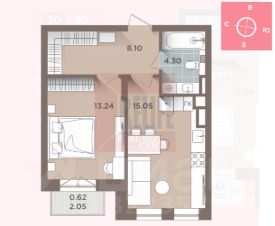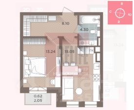 Общая площадь квартиры 41.31 кв.м, комната 13.25 кв.м с выходом на балкон, просторная кухня-столовая 15.05 кв.м, холл 8.1 кв.м с предусмотренной гардеробной и совмещенный санузел. Окна квартиры выходят на запад и открывают вид на живописный сквер.